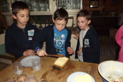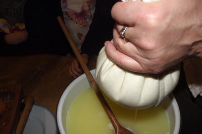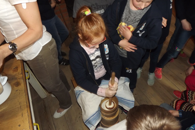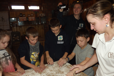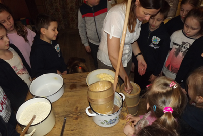 Zwiedzanie rozpoczęliśmy od wizyty w Chlebowej Chacie. Miejsce to jest wyjątkowe, pozwalające poczuć klimat czasów już utraconych, kiedy wielki piec stanowił serce domu i cała rodzina skupiała się wokół niego, bowiem tylko przy nim było ciepło i wokół niego toczyło się życie mieszkańców. Piec w Chlebowej Chacie dalej pełni właśnie taką funkcję. Podczas warsztatów Gospodarze pokazują drogę ziarenka zboża do gotowego bochenka chleba. Czuć tam wspaniały zapach świeżego chleba, który okrasić można samodzielnie wykonanym masłem czy polać swojskim miodem.
