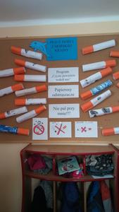 Przedszkole przystąpiło do realizacji programu edukacji antytytoniowej „Czyste powietrze wokół nas". W projekcie brało udział 70 dzieci. Pierwszą formą realizacji programu był cykl zajęć dydaktycznych skierowany do dzieci, składający się z zajęć warsztatowych: - co i dlaczego dymi, - jak sie czuję, kiedy dymi papieros, - co się dzieje, kiedy ludzie palą papierosy, - jak unikać dymu papierosowego. Założeniem programu było wykształcenie u dzieci świadomej umiejętności radzenia sobie w sytuacjach, w których inne osoby palą przy nich papierosy, oraz wzrost kompetencji rodziców w zakresie ochrony dzieci przed ekspozycją na dym tytoniowy. Dzięki tym zajęciom dzieci zwiększyły wiedzę dotyczącą szkodliwości dymu. Obserwowały podczas wycieczki źródła dymu, projektowały własny znaczek ,,Nie pal przy mnie", rysowały różne źródła dymu, zapoznały się z postacią Dinka i nauczyły się jego piosenki. Na zakończenie zajęć został zredagowany list, w którym powiadomieni zostali rodzice o zakończonych zajęciach z edukacji zdrowotnej. Dzieci dostały również dyplomy i kolorowanki związane z programem. Bogusława Nowak