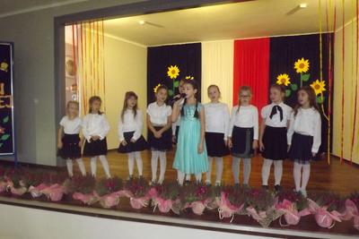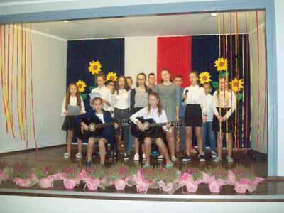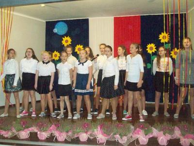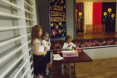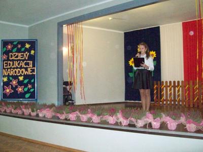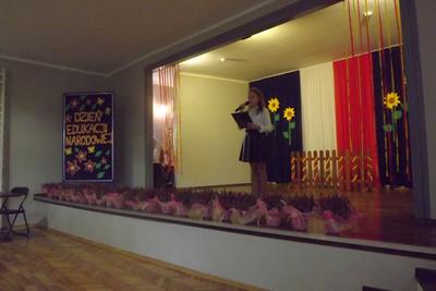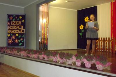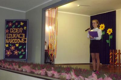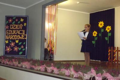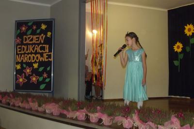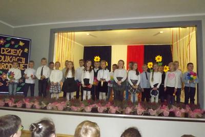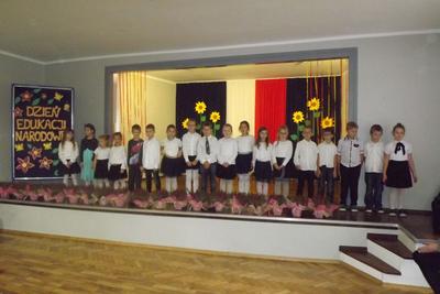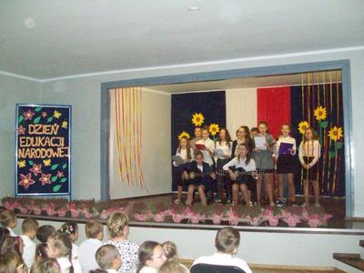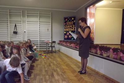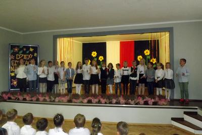 Akademię z okazji Dnia Edukacji Narodowej przygotowała VI klasa, ale udział w obchodach wzięła cała szkoła. Klasa pierwsza zaśpiewała piosenkę pt. "Jesteśmy razem". Filip Adamicki uświetnił uroczystość swoją piękną grą na skrzypcach a Emilia Franica dała popis umiejętności wokalnych. Uczniowie drugiej klasy zaśpiewali piosenkę pt. "Druga klasa". Dodatkowo Julia Dyrszlag wraz z chórkiem wykonała utwór "Będę nauczycielką". Z kolei trzecioklasiści dedykowali Pani Dyrektor piosenkę "Gdy dyrygent w naszej szkole". Wysłuchaliśmy również koncertu gry na dzwonkach i flecie w wykonaniu: Nicoli, Karoliny, Oliwi, Kuby i Martyny. W piosence "Odchodzi lato", prezentowanej przez IV i V klasę, mieliśmy okazję podziwiać popis taneczny w rytmie cza-cza Pauliny Piły i Olivera Genstego. Klasa V i VI zaśpiewały ponadto piosenkę "Nasza szkoła". Finał akademii zwieńczyła autorska piosenka szóstoklasistów dotycząca wszystkich pracowników szkoły. W trakcie uroczystości złożono również podziękowania oraz najserdeczniejsze życzenia odchodzącej na emeryturę pani Stefanii Franicy.