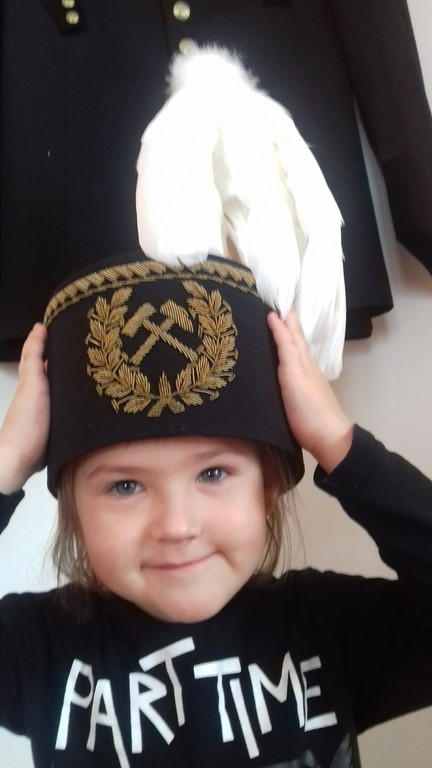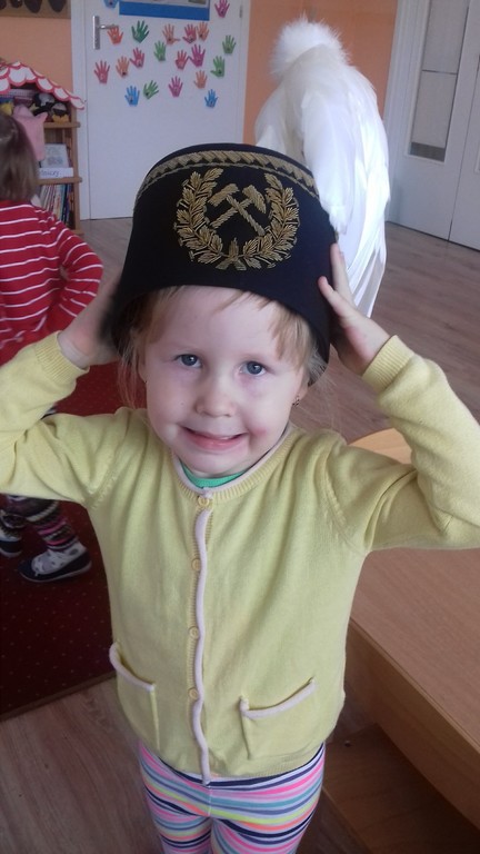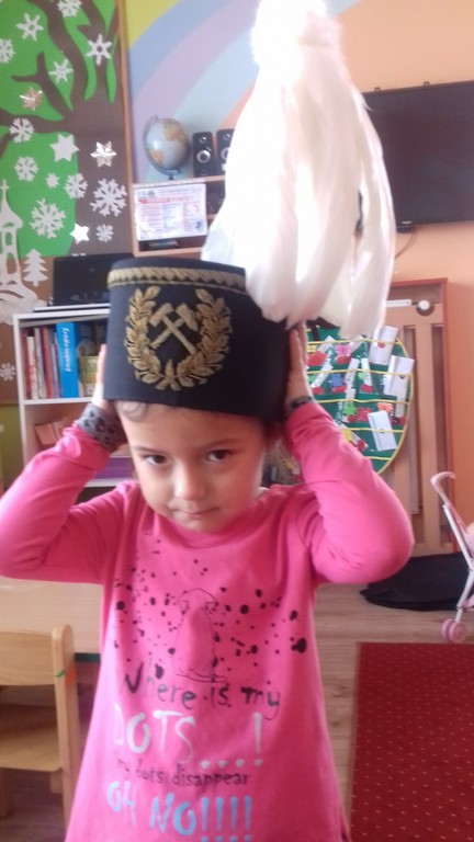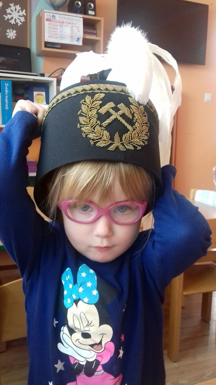 Dzieci miały możliwość zobaczenia jak wygląda strój- mundur Górnika, miały możliwość dotknięcia i przymierzenia hełmu. Praca górnika to pojecie, które kojarzy się jednoznacznie – praca na kopalni. Warto jednak zaznaczyć, że zawód górnika nie zawsze oznacza to samo. „Górnik jest pracownikiem, zatrudnionym pod ziemią i wydobywającym – w zależności od kopalni – określony surowiec. Najwięcej górników zatrudnionych jest w kopalniach węgla i zajmuje się wydobywaniem właśnie tego surowca. Praca pod ziemią może być jednak bardzo różna. Najcięższym rodzajem pracy górnika, jest praca „na przodku”, czyli w bezpośrednim rejonie wydobycia. Górnicy przodowi pracują w bardzo ciężkich warunkach. Często w ciemności, w wymuszonej pozycji ciała, w wysokiej temperaturze, pyle i kurzu, kują kilofami, uzyskując w ten sposób surowiec.” Czarne złoto pozyskiwane na naszym terenie stało się symbolem naszego regionu. Dzieci z najmłodszej grupy z zainteresowaniem słuchały opowiadania nauczyciela oraz oglądały obrazki oraz prawdziwe akcenty górniczej pracy, niektórym dzieciom przecież tak bliskie, bo przecież w rodzinach naszych dzieci niejednokrotnie dziadek, czy tata jest górnikiem. Poznaliśmy również postać Św. Barbary patronki górników.