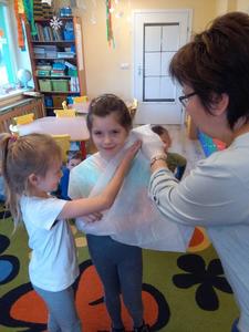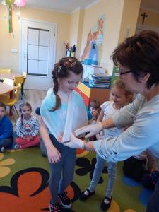 W trakcie prowadzonych zajęć, dzieci obserwowały w jaki sposób należy prawidłowo wykonać opatrunek medyczny oraz zapoznały się z dostępnymi środkami opatrunkowymi. Miały też możliwość nauki, jak za pomocą chusty usztywnić złamaną rękę oraz nauczyły się, jak wygląda pozycja boczna ustalona i pod okiem p. Celiny ćwiczyły bezpieczne ułożenie ciała. Najciekawszą, a zarazem najtrudniejszą rzeczą podczas tych zajęć była nauka, jak pomóc osobie, która jest nieprzytomna i nie oddycha. Na specjalnych manekinach, które otrzymaliśmy ze środków zebranych przez WOŚP dzieci ćwiczyły jak prawidłowo wykonuje się resuscytację.