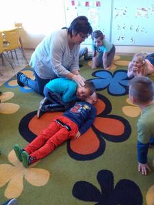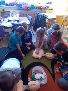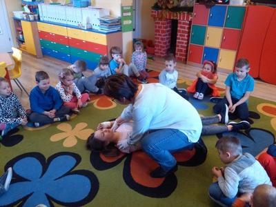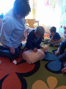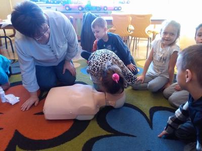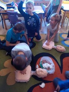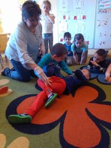 Udzielanie pierwszej pomocy jest naszym obowiązkiem, jednak bardzo często w sytuacjach zagrożenia nie wiemy jak się zachować. Dzieci uczyły się jak należy sprawdzać przytomność osoby poszkodowanej i w jaki sposób można komuś pomóc zanim przyjedzie pogotowie ratunkowe. Poza tym utrwaliły sobie numery alarmowe, oraz jakie informacje trzeba podawać podczas wzywania pomocy.