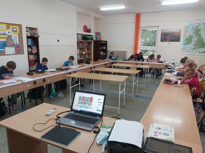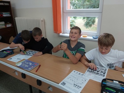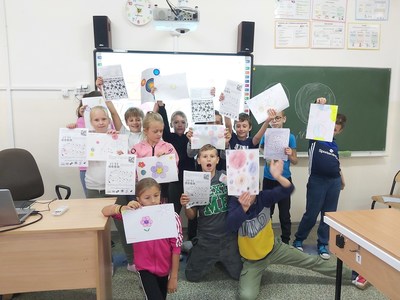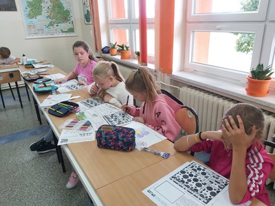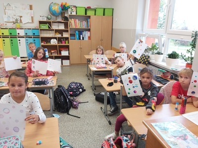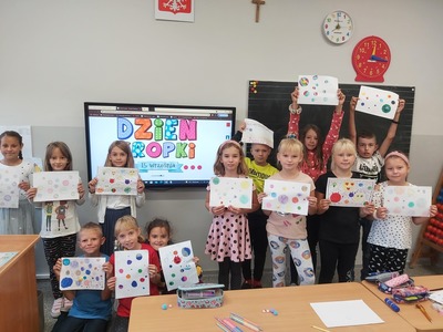 Szkolne obchody rozpoczęliśmy od obejrzenia filmu o małej Vashti, po czym dzieci odpowiadały na „kropkowe pytania”. Uczniowie mogli pokazać swoje kropkowe, kolorowe stroje, rozwiązali krótkie zadania matematyczne i zagrali w kropki. Na zakończenie naszego świętowania każda klasa wykonała swoje kropkowe prace.