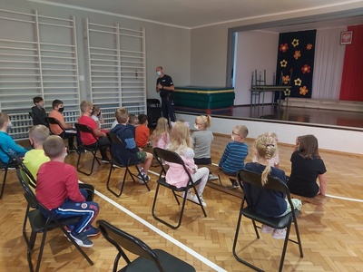 Główny cel jaki przyświecał spotkaniu z uczniami to kształtowanie i promowanie pozytywnych postaw w zakresie bezpieczeństwa i przygotowanie uczniów do odpowiedzialnych zachowań w różnych sytuacjach. Policjant zwrócił uwagę na bezpieczeństwo na drodze i zagrożenia wynikające z nieprzestrzegania przepisów ruchu drogowego. Uczniowie chętnie dzielili się swoją znajomością przepisów np. dotyczących ruchu pieszych, przewożenia dzieci w samochodzie (w fotelikach, zapiętych pasach), zalet noszenia elementów odblaskowych, bezpieczeństwa podczas jazdy na rowerze, itp. Spotkanie propagowało wiedzę o bezpieczeństwie w życiu codziennym, w domu, w szkole, podczas zabaw.