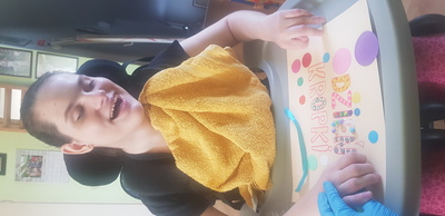 Karolina, uczestniczka zajęć rewalidacyjno-wychowawczych, to prawdziwa artystka. Swoim uśmiechem i zadowoleniem podczas prac plastycznych pokazuje, że najważniejsza jest radość tworzenia. Motywem przewodnim jej dzieła jest oczywiście „kropka”, a raczej mnóstwo kolorowych kropek. Karolina również poznała historię bohaterki opowiadania „The Dot” (Kropka), która dzięki kropce uwierzyła w siebie i stała się artystką.