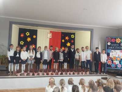 Pani Dyrektor złożyła serdeczne życzenia wszystkim pracownikom szkoły, podziękowała za trud wkładany w kształcenie i wychowanie młodych pokoleń. Pan Wójt Grzegorz Niestrój złożył na ręce Pani Dyrektor kwiaty i życzenia dla całego grona pedagogicznego.