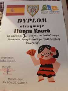 I miejsce w tym konkursie zdobyła Hania Knura z klasy V i była to jedyna uczestniczka z naszej szkoły. Bardzo jej gratulujemy kolejnych już sukcesów. Gracias.