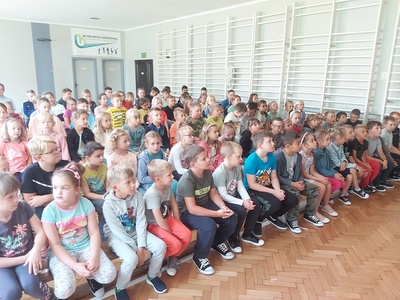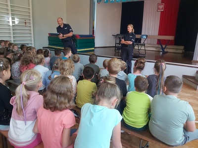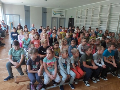 7 września na sali gimnastycznej gościliśmy pana dzielnicowego Kazimierza Kruczka oraz panią asp. Szt Lidią Milołajczyk, policjantów Komendy Powiatowej Policji w Raciborzu. Wszyscy uczniowie wraz z nauczycielami zostali zaproszeni na pogadankę dotyczącą podstawowych zasad poruszania się po drodze. Pan policjant zwrócił szczególną uwagę na prawidłowe przechodzenie przez jezdnię, poruszanie się na rowerze oraz wspomniał jak ważnym elementem bezpieczeństwa są odblaski, które każdy uczeń powinien posiadać.