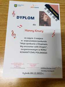 Jesienią zorganizowano konkurs wojewódzki „Moje spotkanie z Chopinem. My encounter with Chopin”. Tematem konkursu było wykonanie komiksu nawiązującego do życia i twórczości wybitnego polskiego kompozytora epoki romantyzmu Fryderyka Chopina. Pracę można było wykonać w dowolnym programie graficznym. Jedynie Hania Knura, uczennica klasy VI podjęła się tego trudnego zadania. Jej komiks musiał zawierać do 12 slajdów, na których należało umieścić właściwe treści z życia i twórczości Chopina. Na wyniki czekaliśmy dosyć długo. Hania spisała się fantastycznie otrzymując drugie miejsce w województwie. Uczennica otrzymała dyplom wraz z nagrodami. Hani serdecznie gratulujemy, a uczniowie poznają jej pracę na lekcjach muzyki, na przełomie lutego i marca, gdy będziemy wspominać sylwetkę wielkiego kompozytora Fryderyka Chopina.