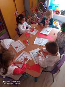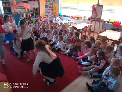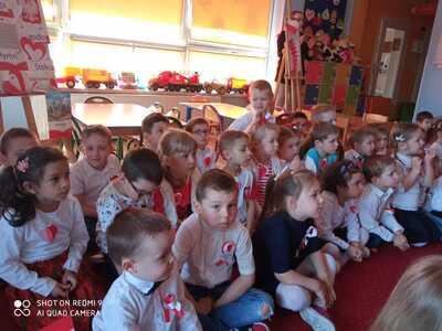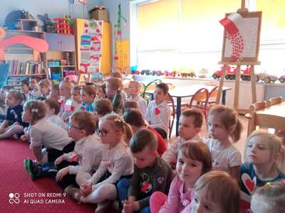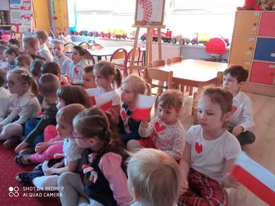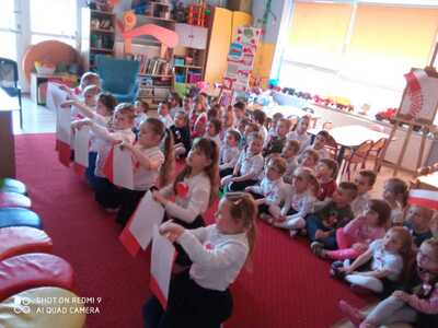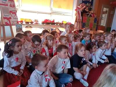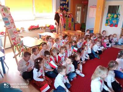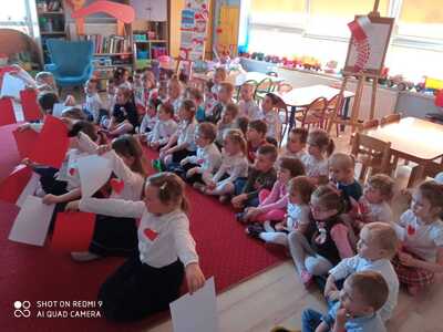 Początek maja to tradycyjnie okres uroczystości upamiętniających najważniejsze wydarzenia, które zapisały się w historii polskiej państwowości. Okres świąt majowych - 1 maja- Święto Pracy, 2 maja- Dzień Flagi Narodowej oraz 3 maja Uchwalenie Konstytucji 3 Maja - to wspaniały czas na przybliżenie dzieciom treści patriotycznych. Tematyka zajęć poprzedzających święta majowe była okazją do przypomnienia wiadomości o naszym kraju oraz naszej historii. 28 kwietnia wszystkie grupy zebrały się aby odśpiewać Hymn Polski, recytować wiersze okolicznościowe. Grupa najstarsza zaśpiewała pieśń „ Majowa jutrzenka” oraz zatańczyła taniec z flagami. Majowe Święta były dla dzieci lekcją przypomnienia sobie, że są Polakami, a Polska to ich Ojczyzna.
