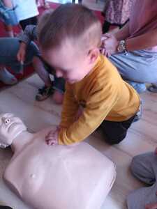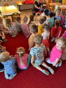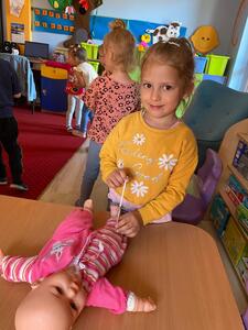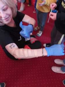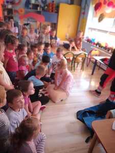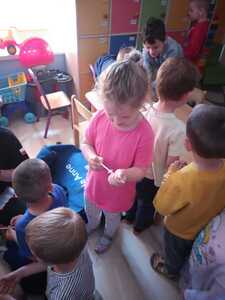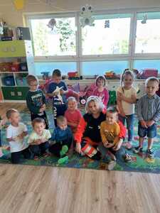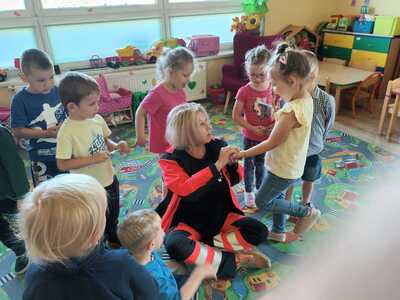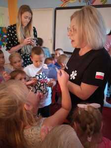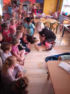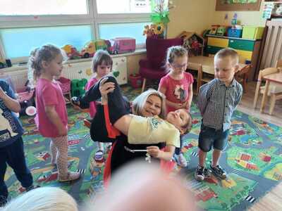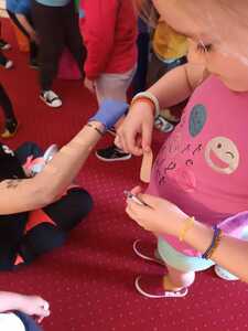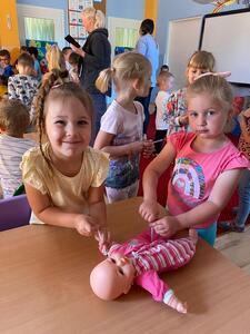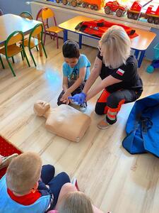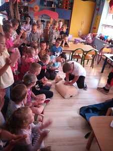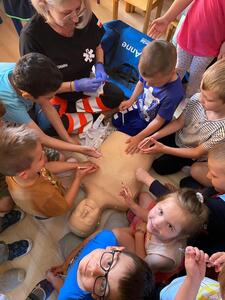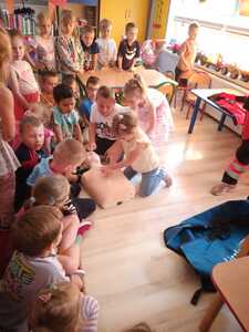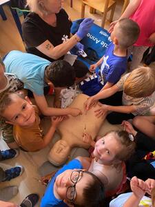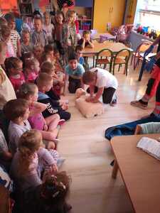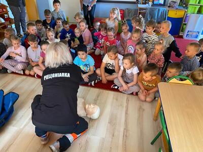 31 maja nasze przedszkole odwiedziła pani Marcelina która na co dzień pracuje jako pielęgniarka i reprezentuje firmę Red Line. Podczas spotkania przedszkolaki miały okazję dowiedzieć się więcej o trudnym zawodzie pielęgniarki, pokonać lęk przed zabiegami medycznymi, a przede wszystkim wzbogacić i utrwalić swoje wiadomości na temat sposobów dbania o zdrowie. Najciekawszą, a zarazem najtrudniejszą rzeczą podczas tych zajęć była nauka, jak pomóc osobie, która jest nieprzytomna i nie oddycha. Na specjalnych manekinach, dzieci obserwowały jak prawidłowo wykonuje się resuscytację. Największe zainteresowanie wzbudziły otrzymane strzykawki, plastry i inne akcesoria medyczne. Pani pielęgniarka pokazywała zakładanie opatrunku na skaleczoną rękę, co zachęciło dzieci do samodzielnego zakładania opatrunku - plastra na rękę kolegi. Wizyta pani pielęgniarki zakończyła się pamiątkowym zdjęciem. Spotkanie przebiegło w miłej atmosferze. Dzieci wykazywały duże zainteresowanie pracą pielęgniarki. Bardzo dziękujemy Pani Marcelinie za miłe spotkanie i poświęcony czas.