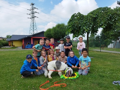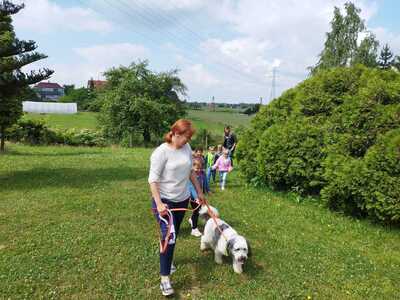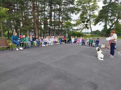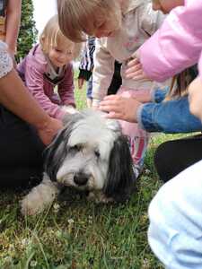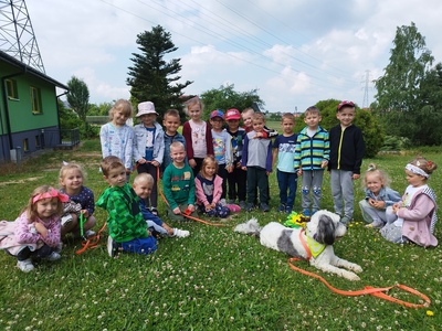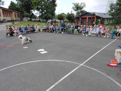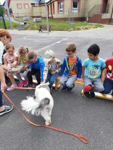 15 czerwca w przedszkolu odbyły się zajęcia pt. „Poznajemy się – jak rozmawiać z psem”, naszym gościem była Pani Michalina oraz piesek o imieniu Beza. Celem zajęć było poznanie zasad zachowania się w obecności psa, sposobów powitań , budowanie pozytywnych relacji w kontaktach ze zwierzęciem. Dzieci podczas zajęć utrwaliły sobie bezpieczną pozycję (żółwia) podczas ataku psa. Przedszkolaki z chęcią karmiły zwierzę oraz uczestniczyły we wspólnej zabawie.