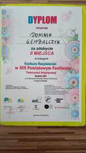 7 czerwca br. w Raciborskim Centrum Kultury odbyło się uroczyste wręczenie nagród XIII Powiatowego Festiwalu Twórczości Artystycznej pod honorowym patronatem Starosty Powiatu Raciborskiego Grzegorza Swobody. Rozdano nagrody w pięciu kategoriach: taniec, teatr, piosenka, plastyka, recytacja. Uczeń klasy VI Szkoły Podstawowej w Pogrzebieniu Dominik Gembalczyk reprezentował naszą szkołę i Gminę Kornowac w kategorii poezja. Jego występ bardzo spodobał się publiczności zgromadzonej w Domu Kultury w Kobyli, zachwycił jury niezwykłą recytacją i wrażliwością artystyczną. Dominik został laureatem tegorocznego festiwalu i otrzymał II miejsce w kategorii Konkurs Recytatorski. Jesteśmy dumni z naszego ucznia i gratulujemy mu sukcesu!