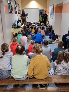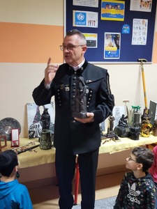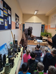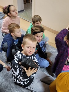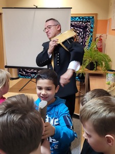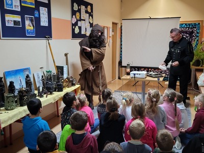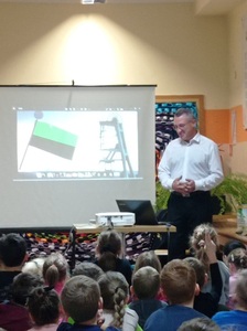 Nasz gość w niezwykle ciekawy sposób, opowiedział, na czym polega praca górnika oraz z czego składa się jego strój. Z prezentacji uczniowie dowiedzieli się między innymi od czego zależy kolor pióropusza i co wyrabiamy z węgla. Nie zabrakło również szeregu ciekawostek oraz wiadomości na temat pracy górnika. Jedną z tych ciekawostek było to, iż w kopalni oprócz człowieka pracowały również zwierzęta, np. kanarki. Te małe ptaszki swoim zachowaniem informowały górników o zbliżającym się niebezpieczeństwie w postaci wybuchu gazu.
