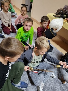 Uczniowie mieli również okazję przyjrzeć się z bliska, dotknąć przyniesione przez górnika rekwizyty, pamiątki...