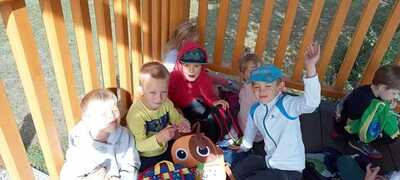 Dnia 26 września nasze przedszkolaki z grup średniaki i starszaki udały się ścieżką przyrodniczo-dydaktyczną „Bociek” na spacer w celu poszukiwania oznak jesieni. W tym dniu pogoda była wyjątkowo piękna. Nie brakowało promieni słońca i ciepłych podmuchów wiatru, dzięki czemu można było świetnie się bawić na świeżym powietrzu.