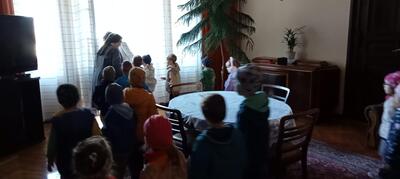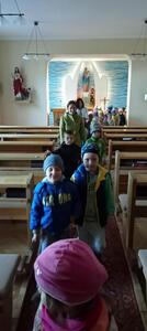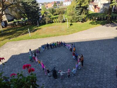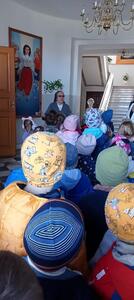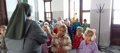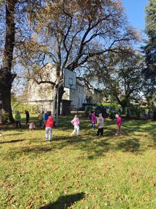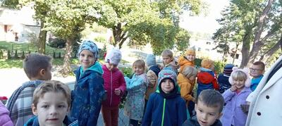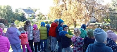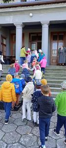 Zostaliśmy zaproszeni do sióstr salezjanek, gdzie obok pięknego pałacu rosną stare kasztanowce. Niektóre kasztany leżały wśród kolorowych liści, inne trzeba było wydobyć z kolczastych łupinek. Kasztany posłużą dzieciom w czasie zajeć plastyczno- technicznych, do przeliczania, porównywania, układania kodów, jak również będą dekoracją w salach przedszkolnych. Oprócz zbierania kasztanów dzieci zostały zaproszone do zwiedzenia pałacu. Siostry interesująco i bardzo ciekawie opowiedziały o historii pałacu. Można było zobaczyć piękne schody, zachowane sztukaterie na sufitach oraz obejrzeć panoramę Pogrzebienia z balkonu. Dzieci obejrzały również kaplicę, która kiedyś była salą balową, oraz dowiedziały się o smutnej historii pałacu w czasie II wojny światowej. Była to wspaniała wycieczka, która pokazała dzieciom, że w swojej miejscowości mamy piękne skarby i ciekawe historie do poznania. Dziękujemy serdecznie siostrom salezjankom również za słodki poczęstunek.