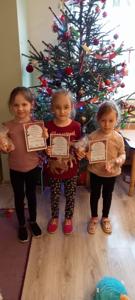 Dziewczynki z naszego przedszkola wzięły udział w Ogólnopolskim konkursie plastycznym na kartkę bożonarodzeniową. Niestety nie zdobyły żadnego miejsca, ale trud ich pięknych prac został wynagrodzony słodkimi upominkami oraz dyplomami. Gratulacje dla nich.