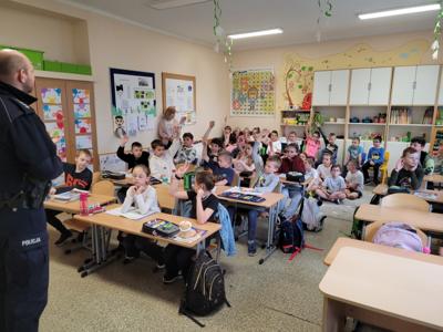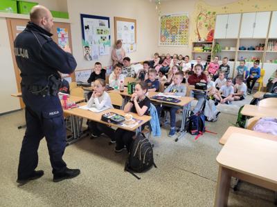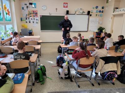 Na zakończenie spotkania uczniowie i nauczyciele serdecznie podziękowali dzielnicowemu st. asp. Kazimierzowi Kruczkowi za przekazaną wiedzę, zaangażowanie i życzliwość. Dzięki takim inicjatywom dzieci są bardziej świadome zagrożeń i potrafią lepiej zadbać o swoje bezpieczeństwo.