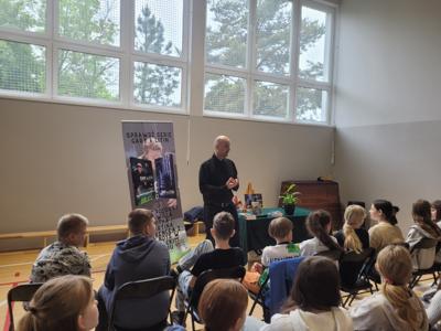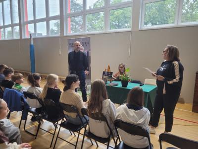 W dniu 20 Maja nasza szkoła miała przyjemność gościć początkującego pisarza i pasjonata historii Kamila Sobika. To młody ambitny pisarz, który za cel wziął sobie tworzenie najlepszych powieści fantasy. Autor m.in. powieści „ W drodze ku wolności” , Gary & Litin Maroszek oraz Gary & Litin Order Cyncynata. Dwie ostatnie powieści można już wypożyczyć w naszej szkolnej bibliotece. Kamil Sobik zdradzał kulisy powstawania książek, w sposób humorystyczny opowiadał o swoim pisaniu, mówił też o problemach z przebiciem się na rynku wydawniczym. Młodzi uczestnicy spotkania dowiedzieli się jak trudną i długą drogę musi przejść pisarz, abyśmy mogli trzymać w rękach jego gotowe dzieło. Uczestnicy spotkania wykazali duże zainteresowanie twórczością młodego pisarza oraz chętnie kupili jego książki.