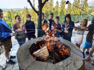 Wieczorem przenieśliśmy się do klimatycznej chaty góralskiej, gdzie rozpaliliśmy ognisko. Były kiełbaski, śmiech, wspólne śpiewy i niezapomniana atmosfera. Zwieńczeniem dnia była długo wyczekiwana dyskoteka – taniec, muzyka i mnóstwo radości! Wieczorem była także okazja do zagrania w piłkę i poćwiczenia na siłowni.