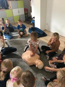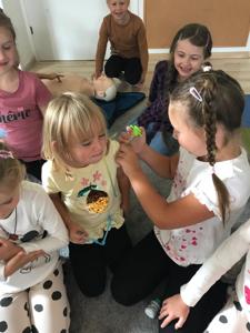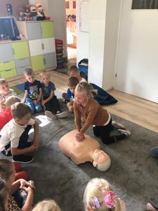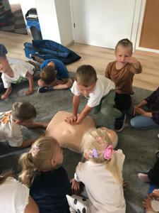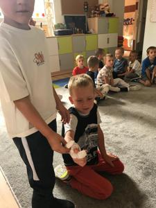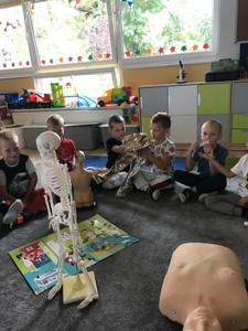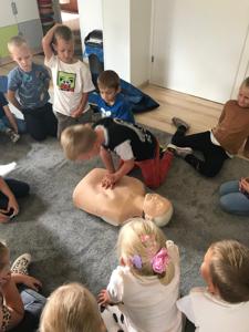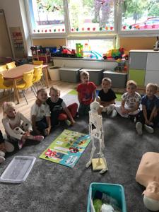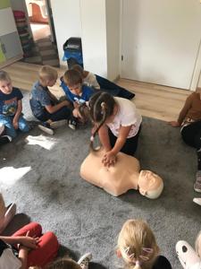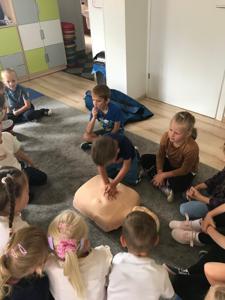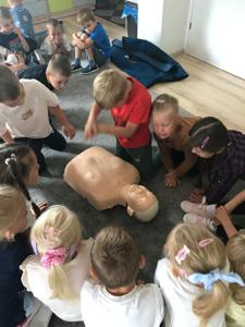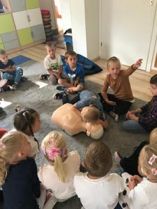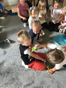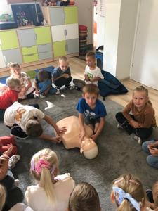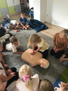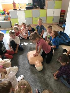 Wrzesień, to miesiąc, w którym obchodzimy Światowy Dzień Pierwszej Pomocy. Celem tego wydarzenia jest edukowanie społeczeństwa i uświadamianie, jak ważne jest udzielenie pierwszej pomocy przedmedycznej w sytuacjach, gdy życie drugiej osoby jest zagrożone. Dzięki zabawom, dzieci przypomniały sobie numery alarmowe, dowiedziały się kiedy należy przeprowadzić resuscytację, jak postępować w przypadku oparzenia, omdlenia, złamania, zakrztuszenia, krwotoku. Poznały wyposażenie apteczki. Największe emocje wśród przedszkolaków wzbudził pokaz resuscytacji na fantomie. Dzieci chętnie ćwiczyły układanie poszkodowanego w pozycji bezpiecznej oraz resuscytację. Obejrzały również film edukacyjny- Pierwsza pomoc.