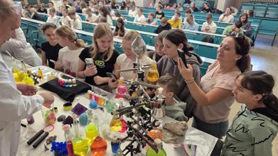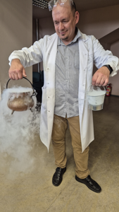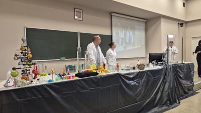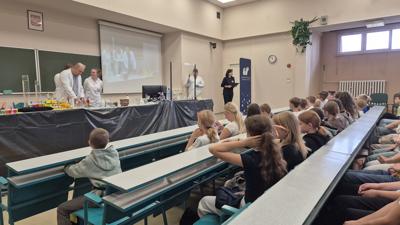 Następnym etapem wycieczki była wizyta w zabytkowym budynku Uniwersytetu Śląskiego – Wydziału Chemii w Katowicach. Uczniowie brali udział w interesujących pokazach pt.: „Magia w chemii” oraz wysłuchali wykładu poświęconego tematowi: „Skąd się biorą leki?”. Uczniowie mogli odkryć, że chemia to nie tylko teoria z podręcznika, ale również widowiskowe doświadczenia oraz dowiedzieć się jak ważna jest to dziedzina naszego życia.