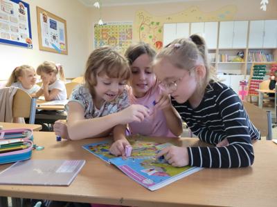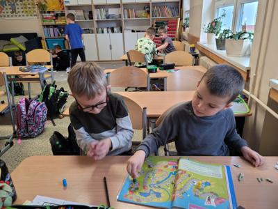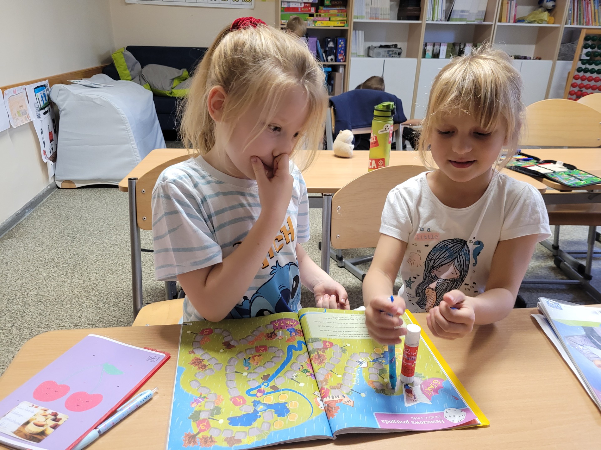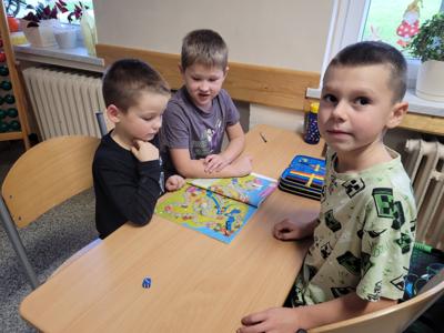 Najmłodsi uczniowie z klasy 1 bawili się w specjalnie przygotowaną grę planszową, dzięki której utrwalali dodawanie w zakresie 6. Nauka przez zabawę sprawiła im mnóstwo radości – każdy rzut kostką był okazją do ćwiczeń i śmiechu.