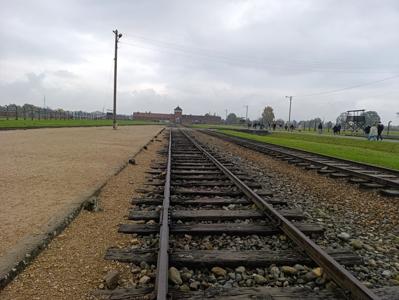 Birkenau (Auschwitz II) – teren obozu zagłady, z rampą kolejową, barakami i ruinami komór gazowych.