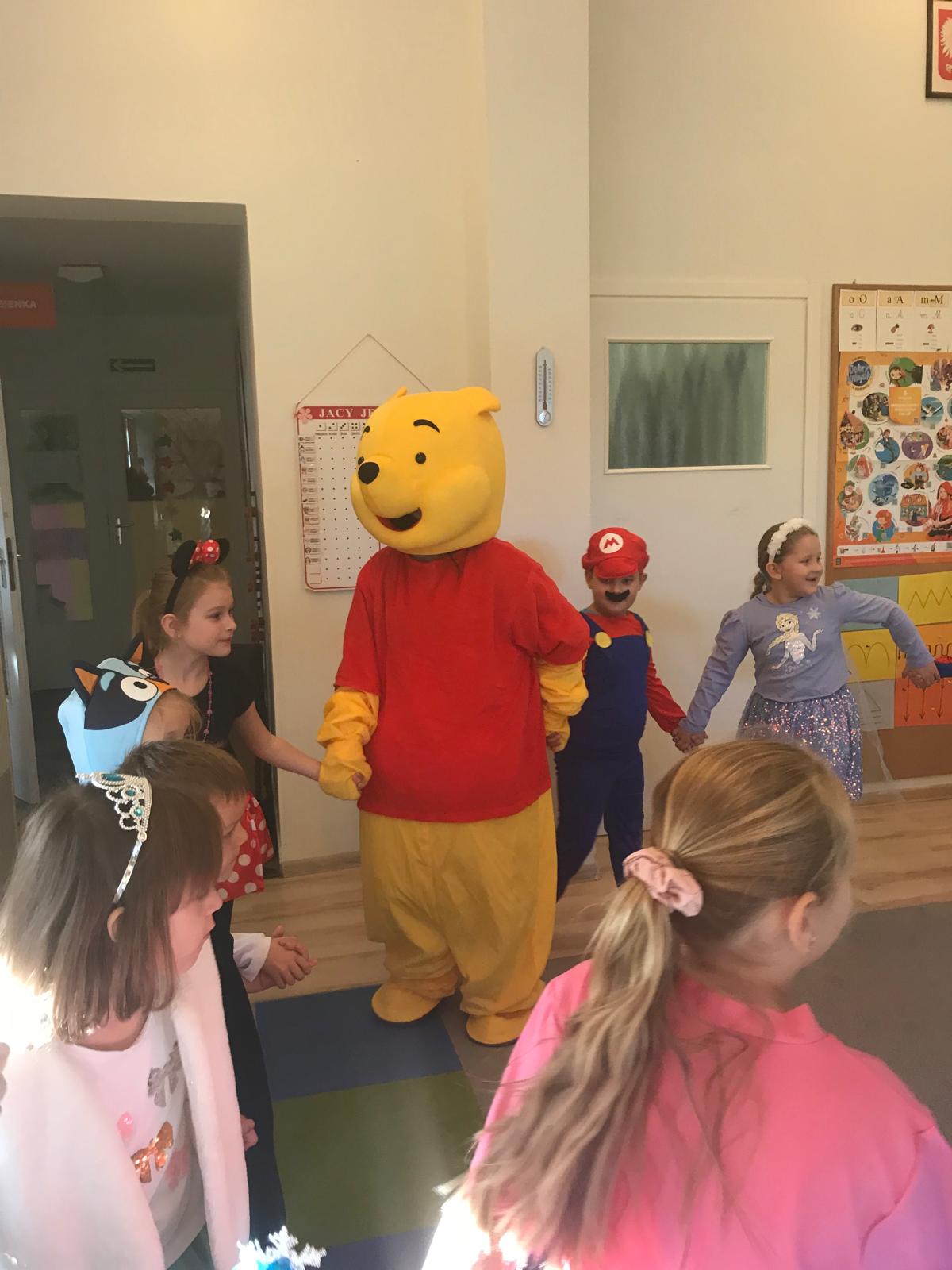 W naszym przedszkolu obchodziliśmy radosny Dzień Postaci z Bajek. Dzieci przyszły przebrane za swoich ulubionych bohaterów tworząc barwny i magiczny nastrój. Wspólnie bawiliśmy się w gry i zabawy inspirowane bajkami, które rozwijały spostrzegawczość i współpracę. Nie zabrakło także tańca z misiem, który wywołał wiele uśmiechów i radości. Podczas zajęć dzieci rozwiązywały zagadki bajkowe, próbując odgadnąć, z jakiej bajki pochodzą ulubione postacie. W części plastycznej przedszkolaki wykonywały swoich ulubionych bohaterów bajkowych w kolorowych aranżacjach. Ten wyjątkowy dzień dostarczył wszystkim wielu pozytywnych emocji, zabawy i wspólnej radości.