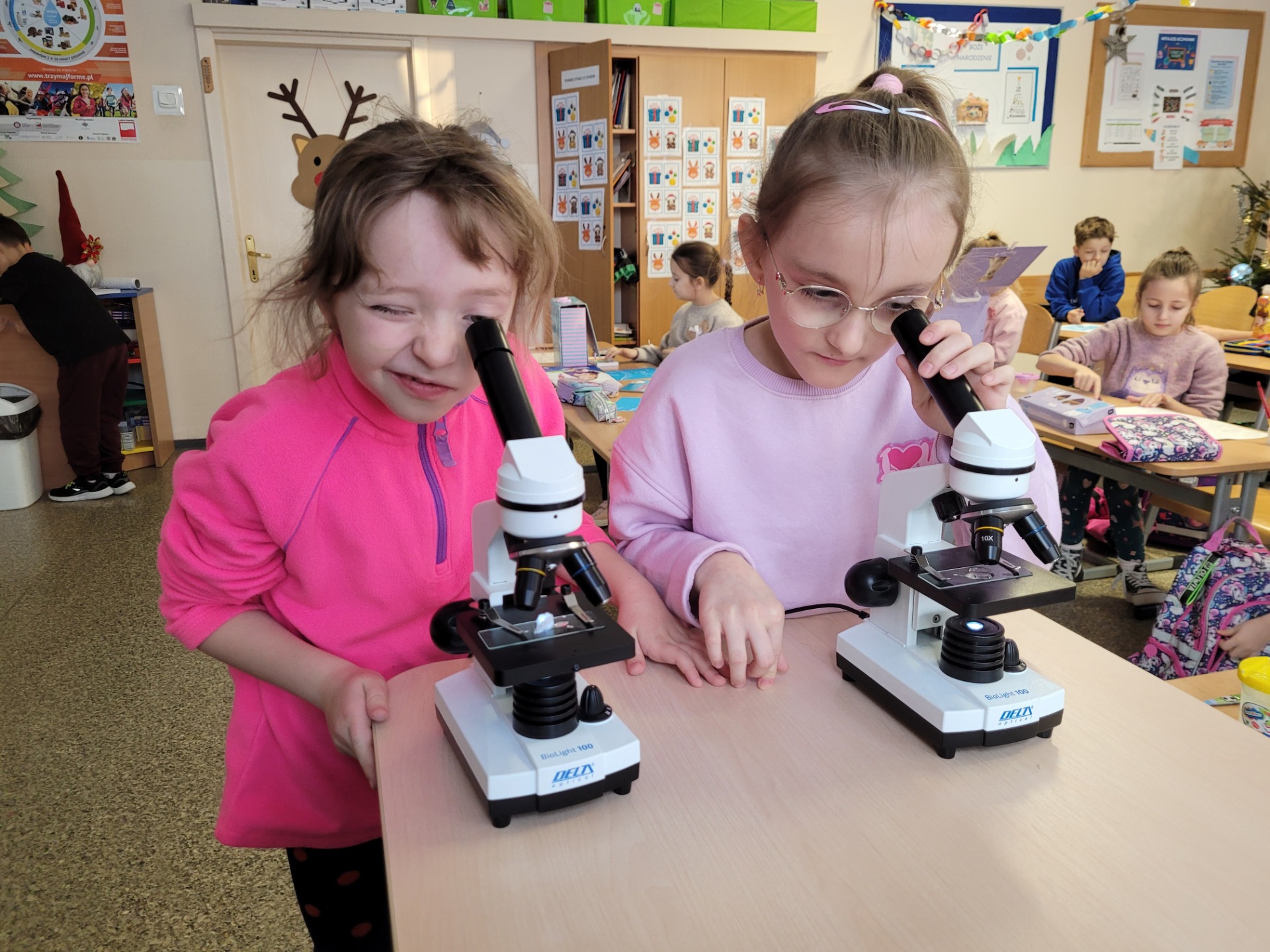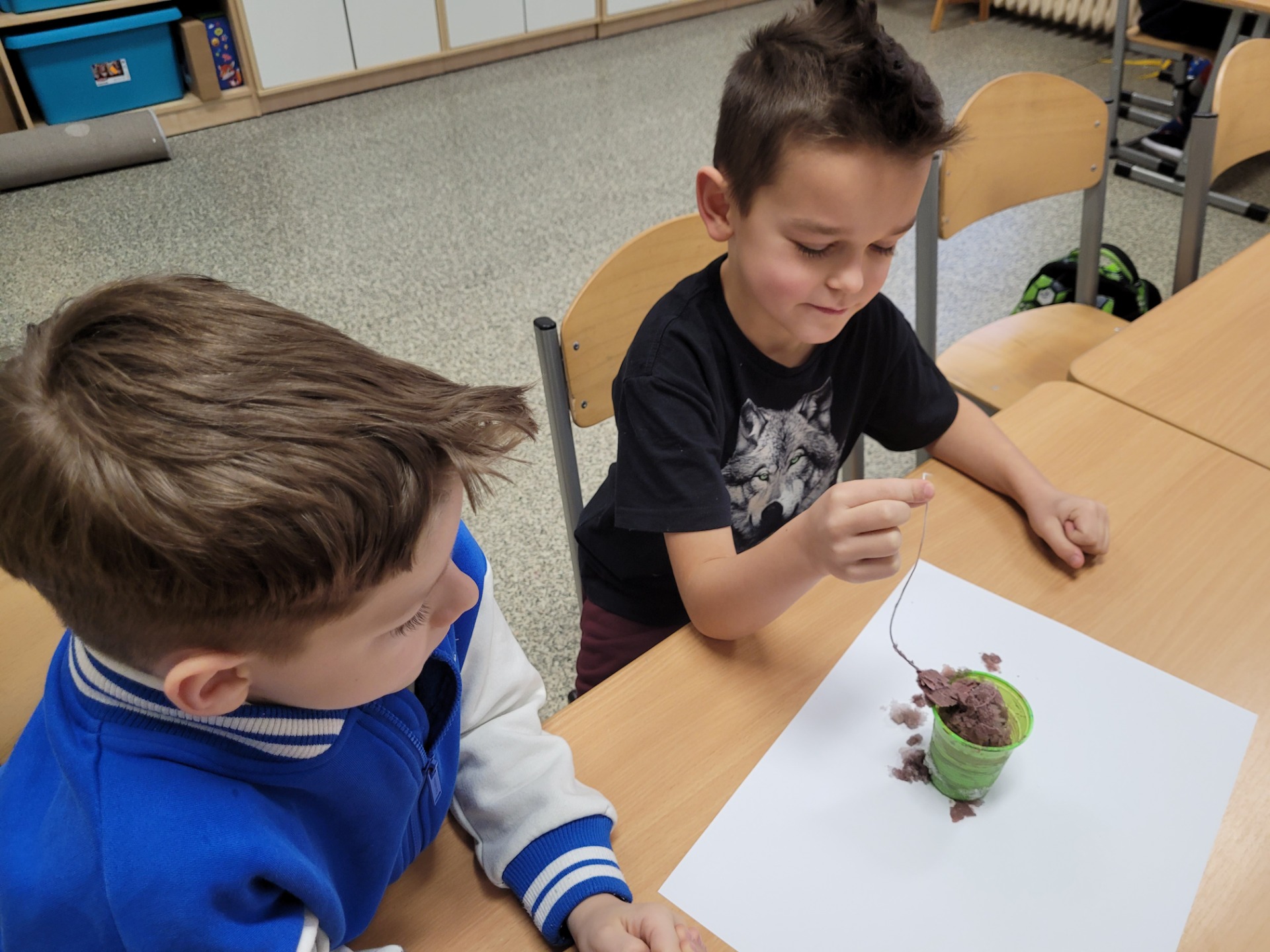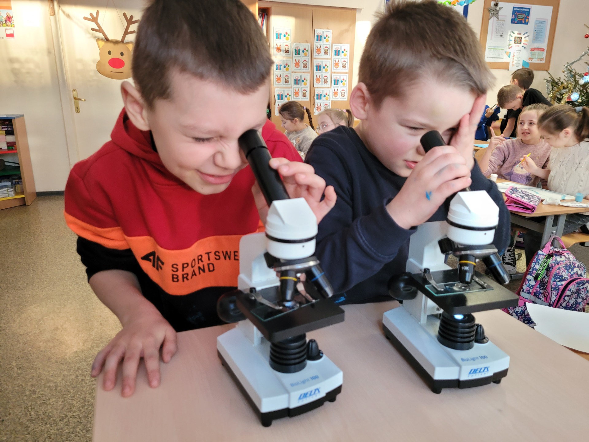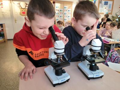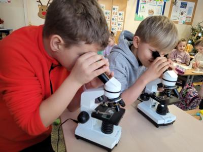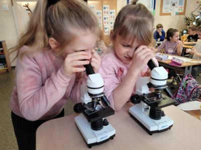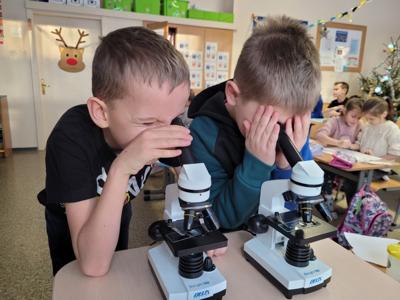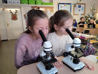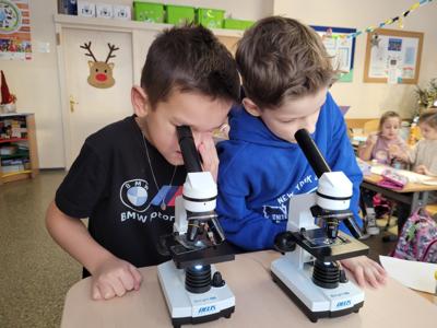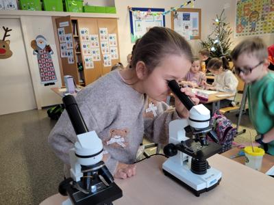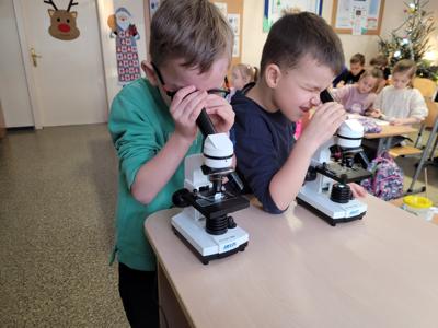 Kolejnym fascynującym doświadczeniem była obserwacja śniegu pod mikroskopem. Dzieci oglądały zarówno śnieżynki, jak i roztopiony śnieg. Ku ich zaskoczeniu w wodzie po stopnieniu śniegu można było dostrzec drobne zanieczyszczenia – maleńkie drobinki, włoski i pyłki. Obserwowaliśmy także, jak świeży, biały puch zmniejsza swoją objętość podczas topnienia, zamieniając się w niewielką ilość brudnej wody.