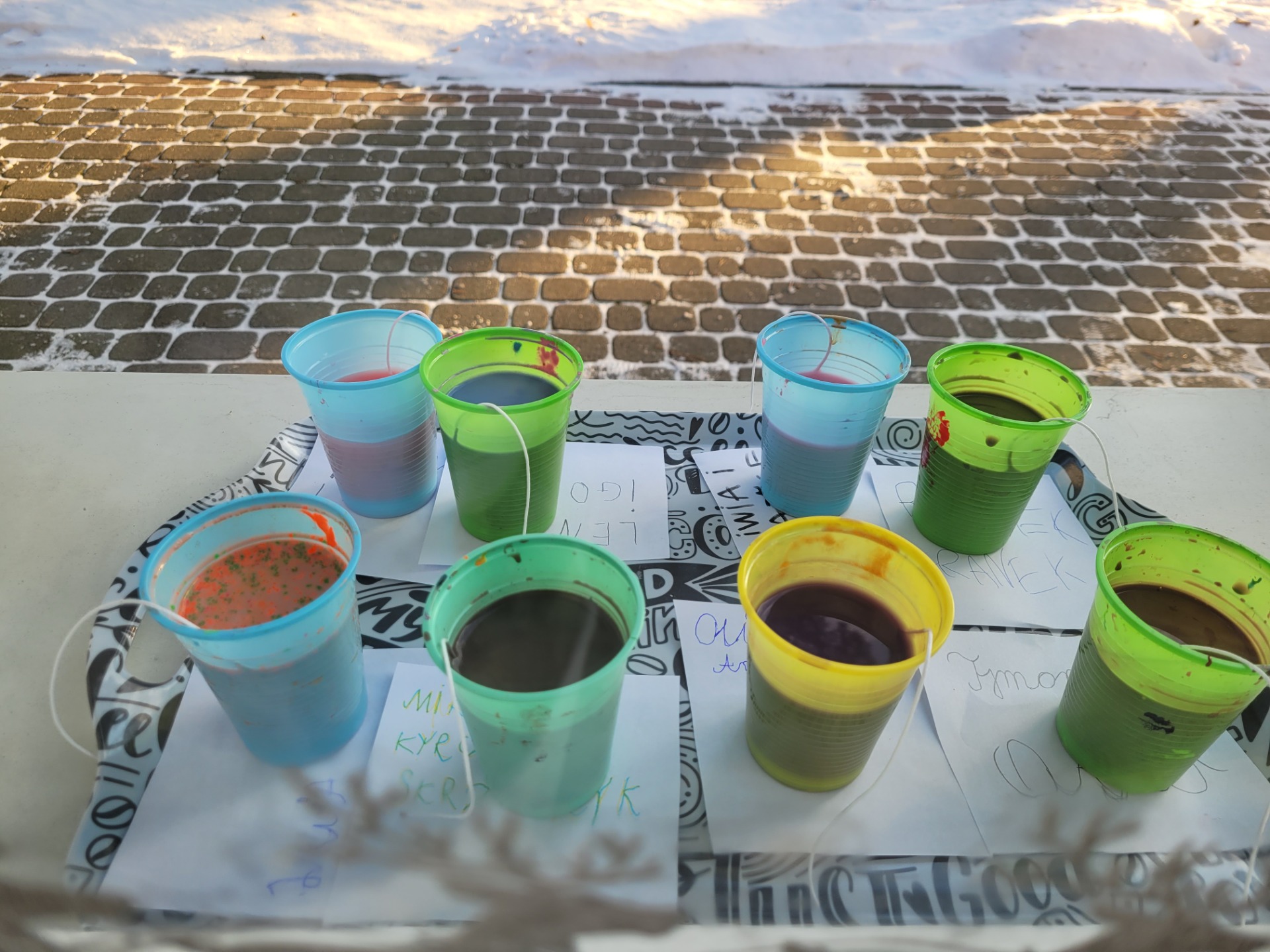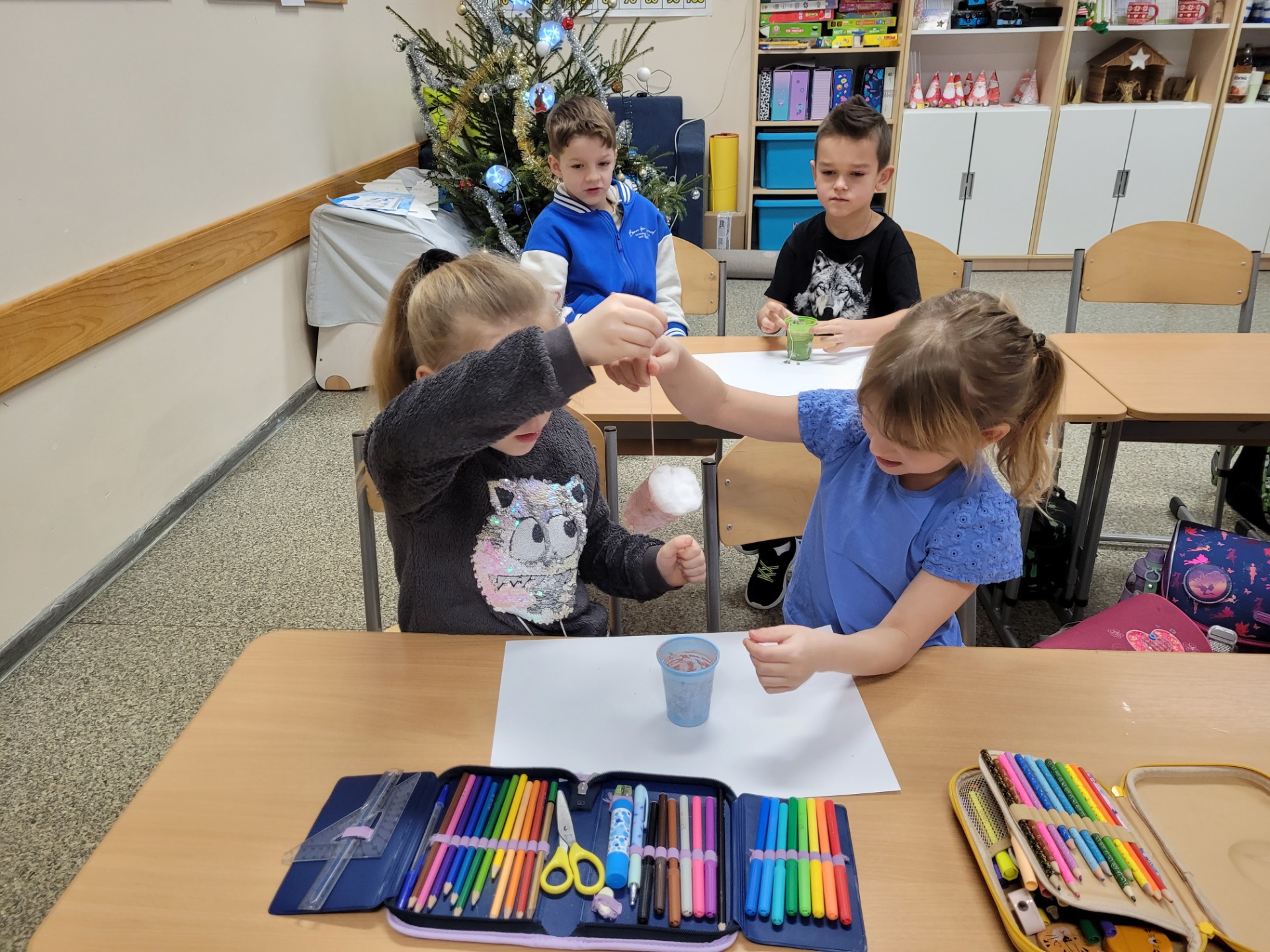 Jednym z pierwszych doświadczeń było zamarzanie wody. Dzieci barwiły wodę farbkami, nalewały ją do kubeczków, a następnie wspólnie obserwowaliśmy proces zamarzania. Pomimo niskiej temperatury okazało się, że woda potrzebuje dużo czasu, aby całkowicie zamarznąć – musieliśmy poczekać aż do następnego dnia. Była to doskonała okazja, aby porozmawiać o bezpieczeństwie zimą i przypomnieć, że nie wolno wchodzić na zamarznięte stawy i jeziora, ponieważ lód zamarza bardzo długo i może być niebezpieczny.