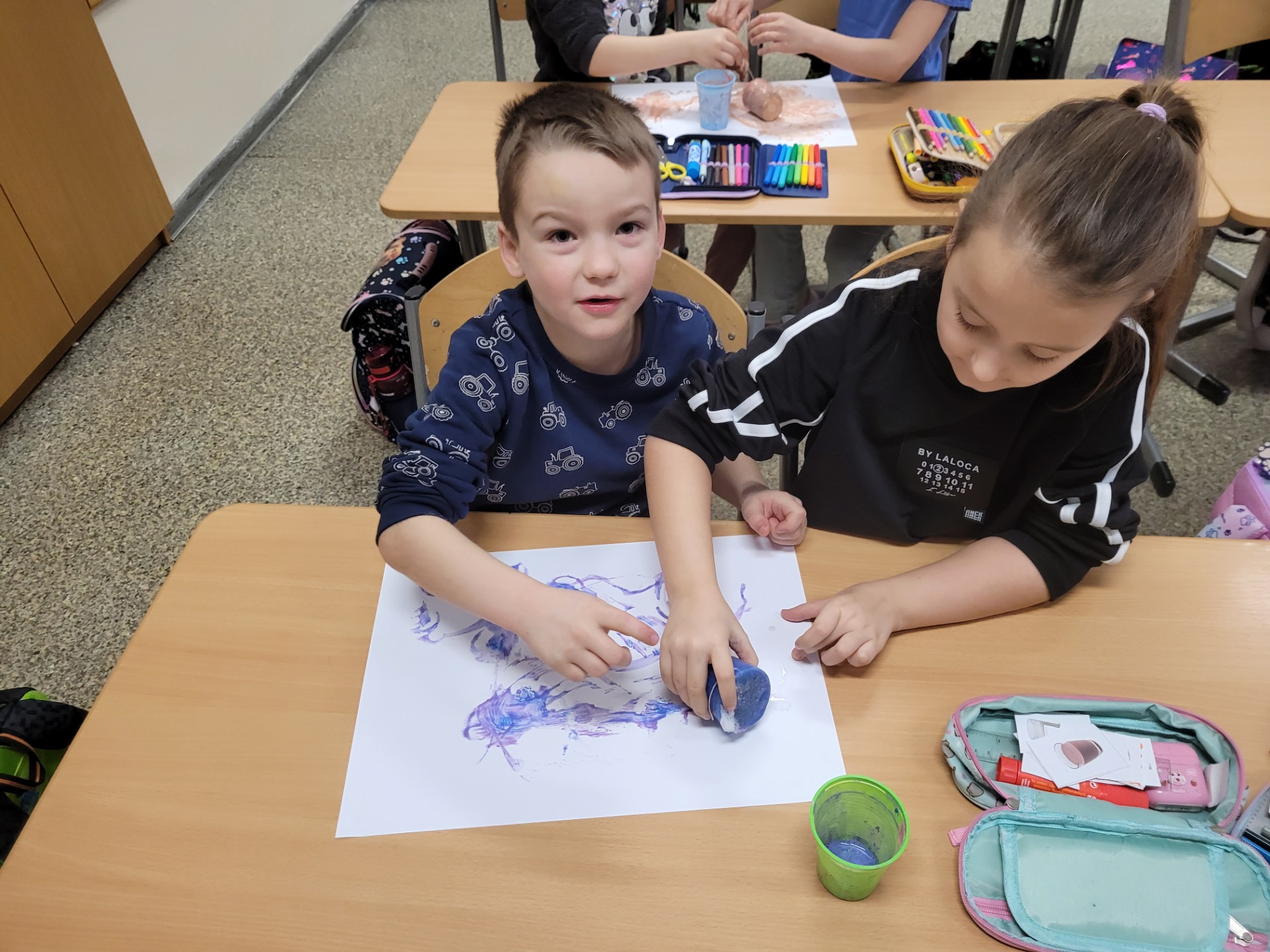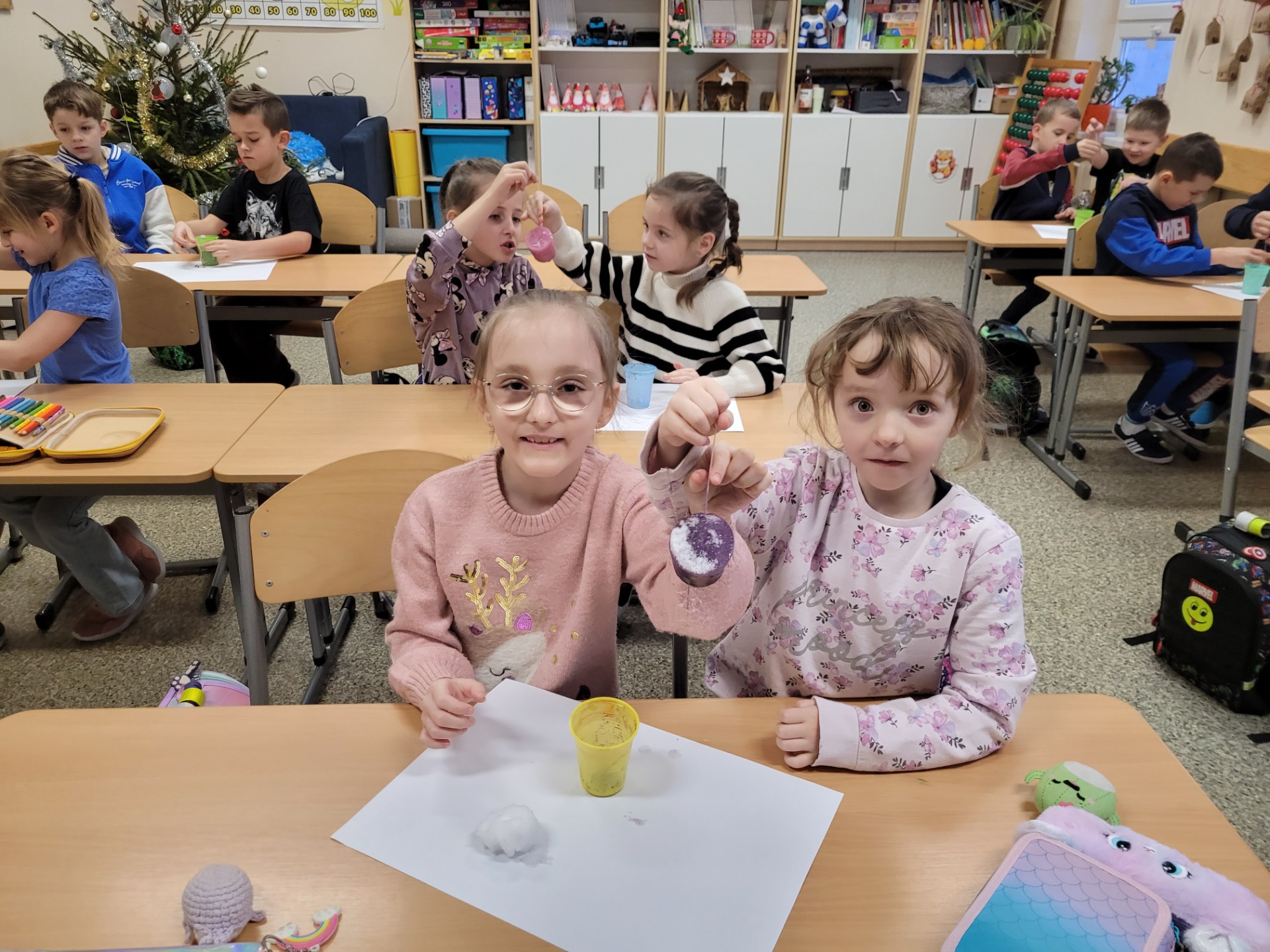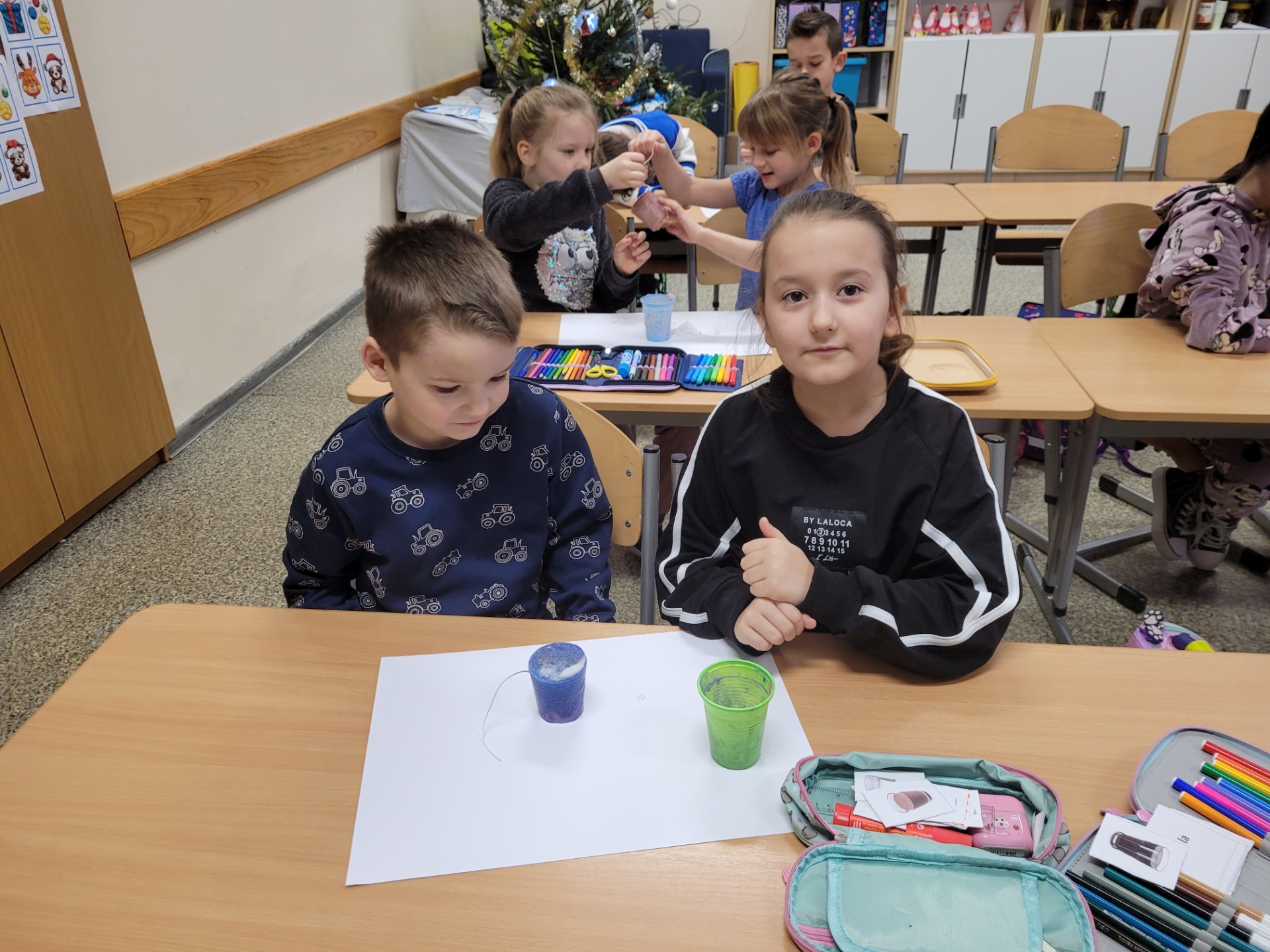 Zamarznięty, kolorowy lód nie poszedł na marne – uczniowie wykorzystali go do malowania tła zimowych obrazków, co sprawiło im wiele radości i pozwoliło połączyć naukę z twórczą zabawą.