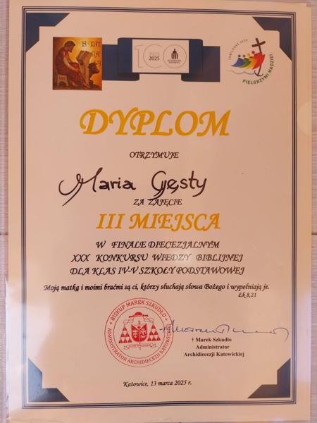 20 marca 2025 Aktualności III miejsce w finale XXX Diecezjalnego Konkursu Wiedzy... Dnia 13 marca uczennica naszej szkoły Maria Gęsty z klasy IV zajęła III miejsce w finale XXX Diecezjalnego Konkursu Wiedzy Biblijnej dla klas IV – V szkół podstawowych. W tym roku był to konkurs ... Czytaj więcej