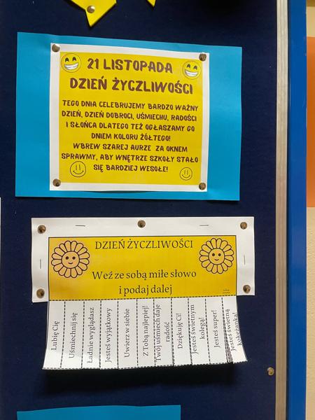 21 listopada 2024 Aktualności „Dzień Życzliwości – Małe Gesty, Wielka Moc!” Z okazji Dnia Życzliwości w naszej szkole odbyły się działania, które miały na celu promowanie dobrych relacji i wzajemnego szacunku. Na szkolnym korytarzu przygotowano specjalną ściankę z... Czytaj więcej