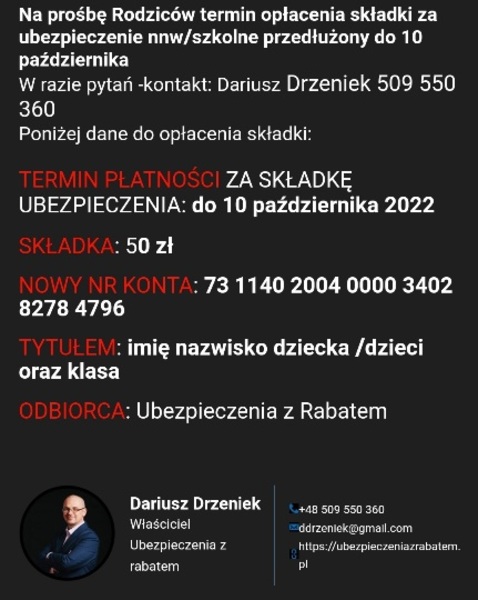 03 października 2022 Aktualności Ubezpieczenie NNW uczniów na rok szkolny 2022/2023 Towarzystwo TUZ Ubezpieczenia ,obejmuje wychowanków ZSP w Pogrzebieniu ochroną ubezpieczeniową w terminie od 01.09.2022 do 31.08.2023 Numer polisy: SZK 0026356 (proszę,na... Czytaj więcej